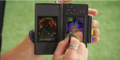 Playing a Guitar Hero: On Tour game on a Nintendo DS Lite.