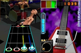 Being played on a Nintendo DS or Nintendo DS Lite's side with the Guitar Grip peripheral inserted in the Nintendo DS (Lite)'s Game Boy Advance slot, the player holds their Nintendo DS (Lite) at a 90° fashion with their hand inserted in the straps and their four fingers aligned on the four colored fret buttons: Green, Red, Blue, and Yellow. While a fret(s) button is held, they can be strummed by swiping the Nintendo DS's touchscreen left or right with the included pick stylus, the Nintendo DS stylus, or the player's unused fingers.
