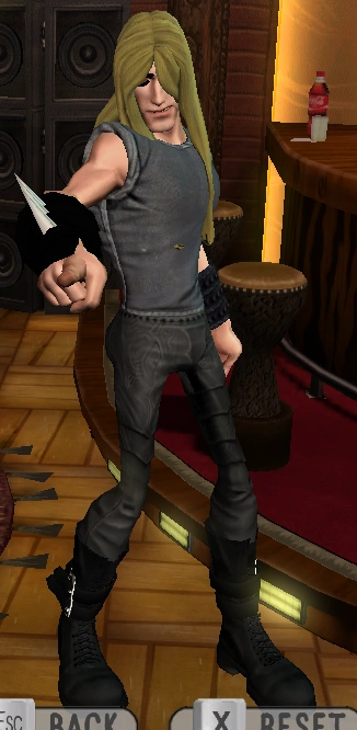 Marcus's appearance is similar to that of Dethklok's lead guitarist, Skwisgaar Skwigelf, sporting long blond hair. His default outfit consists of a dark gray sleeveless shirt, spiked wristbands and black pants and boots. Even the ending cutscene for Guitarists show Marcus in a Mordhaus-esque building.